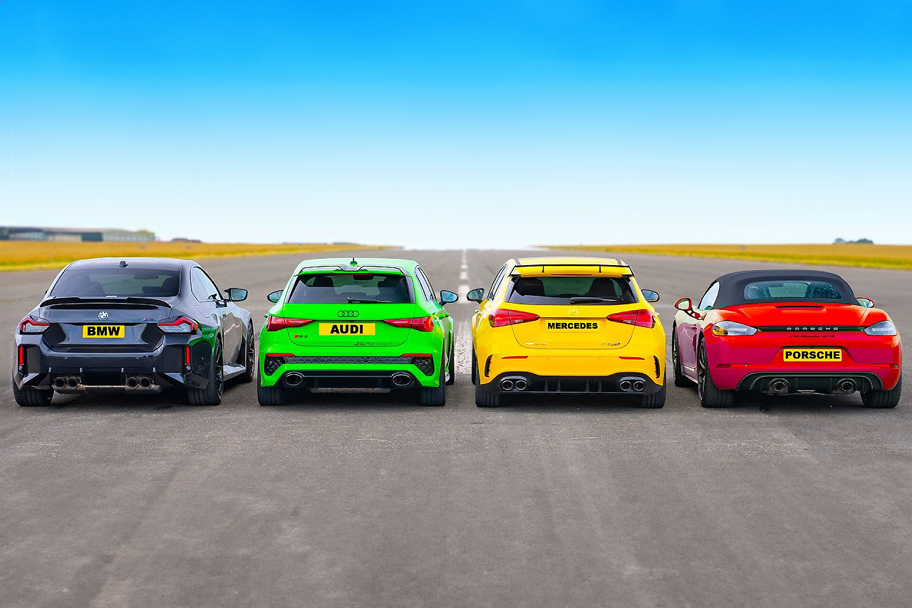 A performance car drag race featuring a BMW M2, an RS3, an AMG A45 S and a Porsche Boxster GTS.